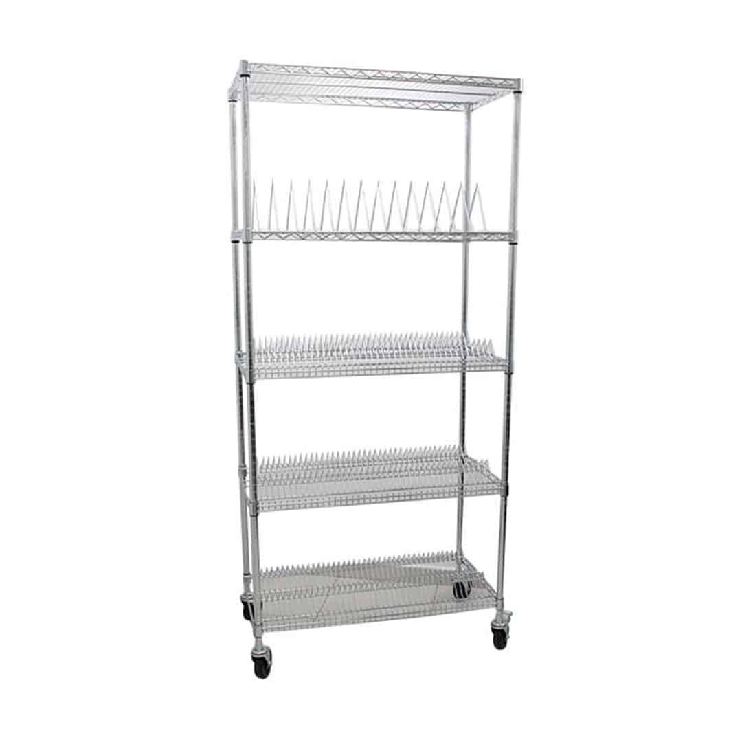 Chrome-plated trolley with fixed dividers for rolls of electronic components. 457x907mm shelf with one row of dividers for large rolls or two rows of dividers for small rolls. Height of 1000mm. Other heights see table. Dimensions and accessories may vary.